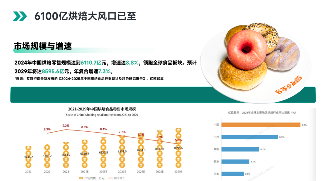 烘焙行业正处在一个特殊的发展阶段。数据显示,2024年烘焙市场规模达6110亿元左右,增速保持在8.8%。预计到2029年,行业规模有望突破8500亿元,维持在7.3%的年均增长。