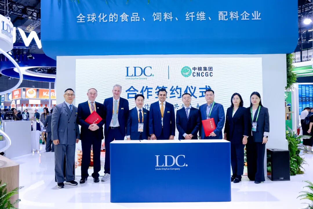 11月6日,在进博会8号展馆8.1B4-01展台,中棉集团与跨国农产品贸易与加工企业路易达孚集团签约。