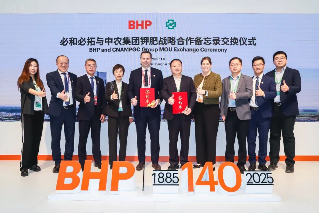 11月6日,在进博会3H展馆3B6-01展位,中农集团与全球最大矿业企业必和必拓签署钾肥战略合作备忘录。