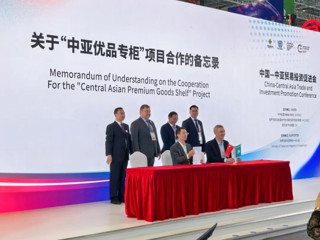 11月7日,在进博会8.2号展馆,中国供销商贸流通集团公司与哈萨克斯坦共和国全国合作社及其他形式经济共同体联盟签订“中亚优品专柜”项目合作备忘录。