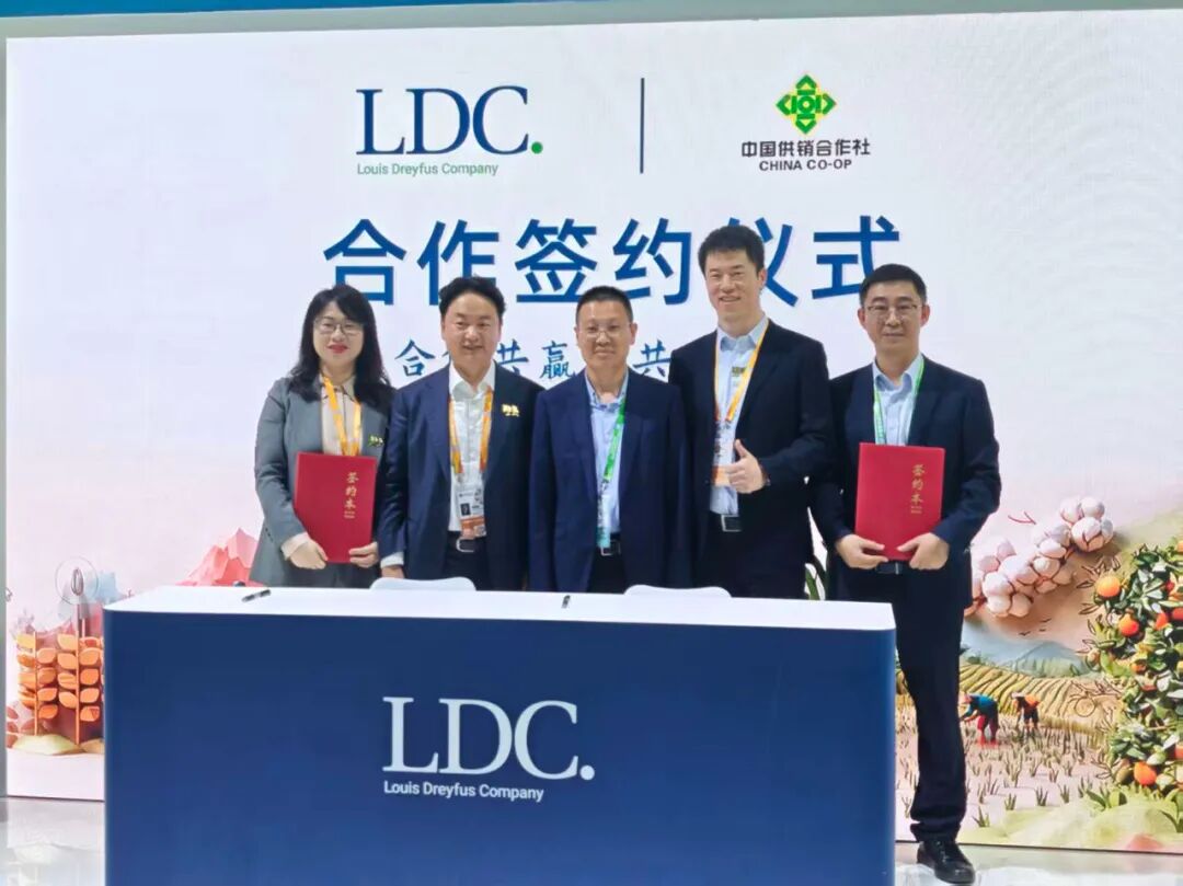 11月6日,在进博会8号展馆8.1B4-01展台,中国供销粮油公司与跨国农产品贸易与加工企业路易达孚集团签约。