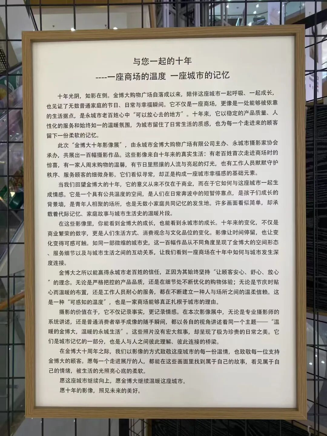在近日举办的“金博大十年影像展”中,上百幅照片记录的皆是平凡生活中的温暖片段:孩子第一次独立购物的瞬间、周末家庭采购的日常、节日中商场点缀的灯影……这些影像折射出商场角色的蜕变,它已经从购物场所,演进为承载社区记忆与情感温暖的城市客厅。