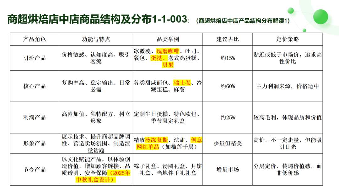 核心产品(占比约60%-70%):复购率高、稳定输出的日常所需。如:瑞士卷、麻薯、吐司、餐包等短保新鲜类产品。这是销售额的基本盘。