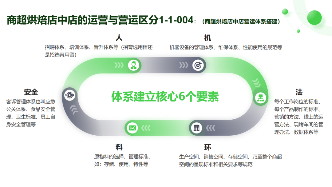运营体系涵盖六大要素:人、机、料、法、环、安。人:建立简单的招聘、培训、晋升体系,尤其是针对商超特点的“招选预留”机制。机:设备的管理、维保与使用规范。料:原料的选用、存储与管理标准。法:各岗位工作标准(SOP)、目标管理方法、数据体系(如客流量、客单价分析)。环:生产、销售、存储空间的标准化规范。安:食品安全、客诉应急公关、员工安全,这是不可逾越的红线。